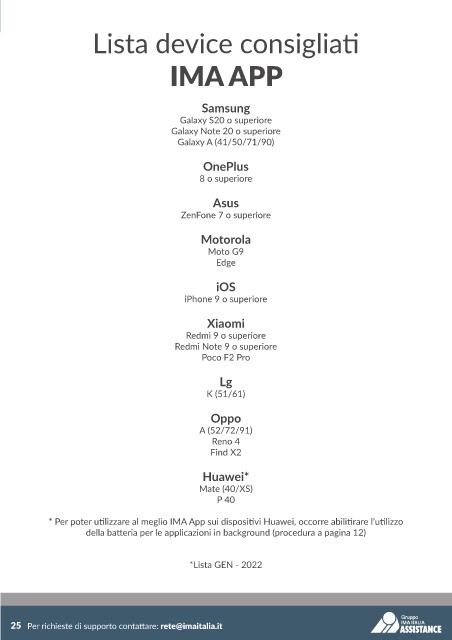 * Per poter utilizzare al meglio IMA App sui dispositivi Huawei, occorre abilitirare l’utilizzo